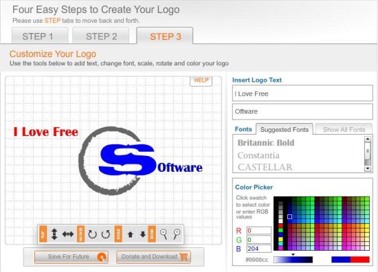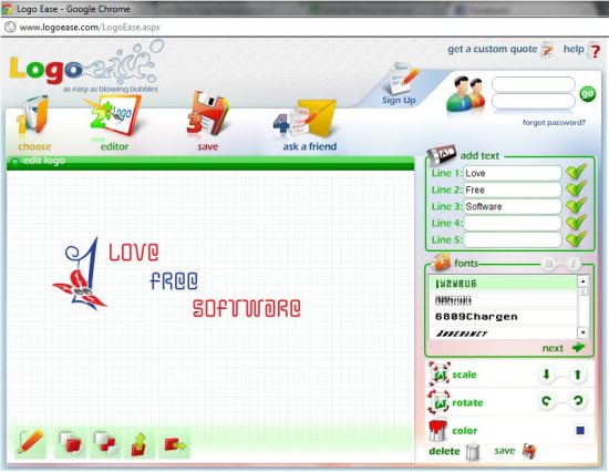 Logomaker is free logo designing web application that helps you to design attractive and meaningful logo for your office card, school project or any other reason. The application is free to use and completely web based, thus you need not waste time in downloading application or sign ups. Use this free application to design your logo and you can put it on anything from business cards and stationery to websites, shirts, hats, pens, and more. Moreover this freeware let’s you create and save up to six different logo designs—all for free.