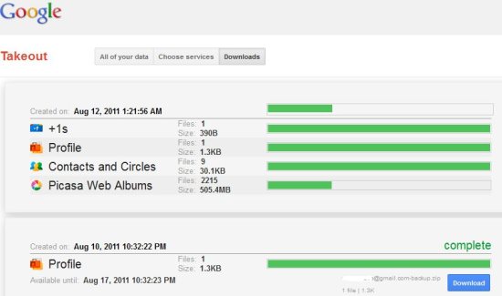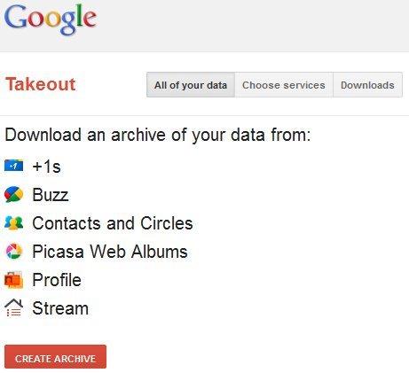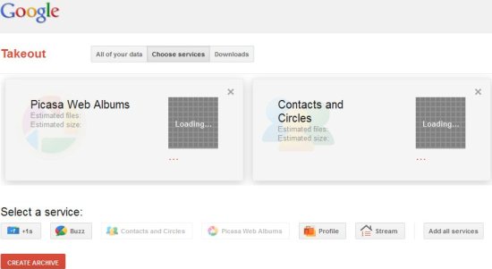 Google Takeout is a free service to create backup of data stored with various Google products in form of an archive. As you all know, Google is offering voluminous services such as Picasa, Buzz, Google Contacts and the just-out Google+. Here comes the livelihood of Google Takeout. It helps to download a library of your data from Picasa, buzz, Google Contacts and Google+.