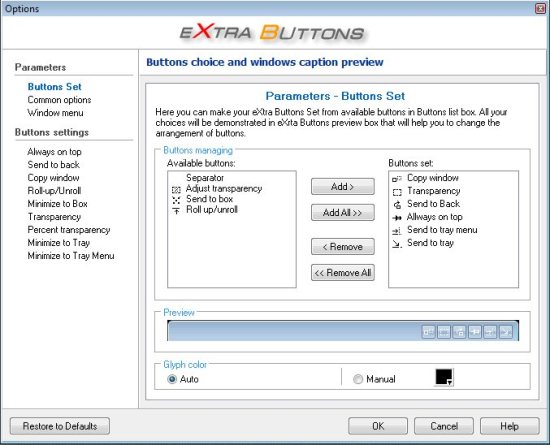 You can always change quantity and sequence of buttons to use only what is necessary. You can also add this application to the blacklist if you do not want the eXtraButtons to appear. You can also assign hot-keys for each button. This application automatically starts on system startup.