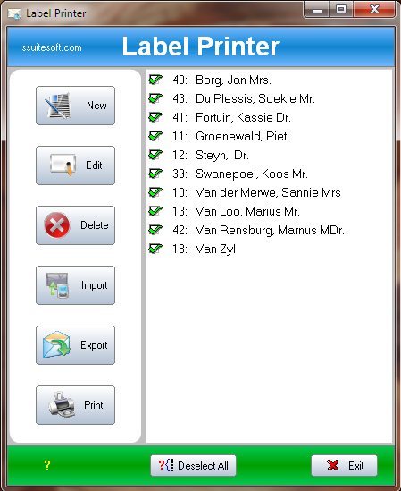 The most common label forms have been added to this application for example it has labels for shipping, sending a parcel, etc. The program also contains a customer or client database with which you can auto fill the labels when you need to.