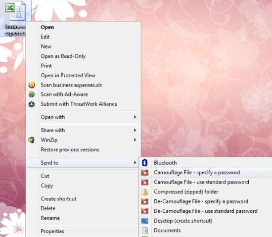 If you clicked the check box to integrate Free File Camouflage in explorer “Send to” menu, then your job becomes much easier. Just right-click on the file you want to encrypt or decrypt. Go to the “Send To” option and in the pop-up menu you will be able to select an option of your choice. Select encrypt or decrypt using a standard password or specifying a new password. Tada, all done.
